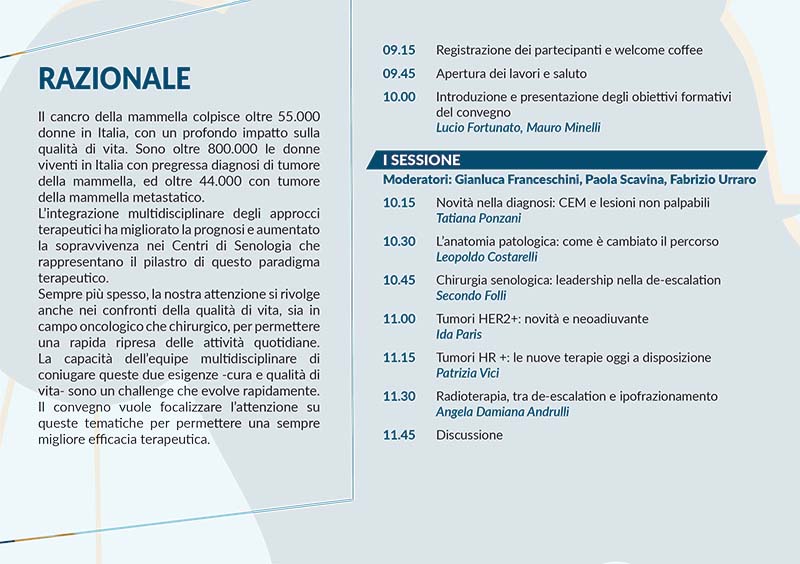 L’integrazione multidisciplinare degli approcci terapeutici ha migliorato la prognosi e aumentato la sopravvivenza nei Centri di Senologia che rappresentano il pilastro di questo paradigma terapeutico. Sempre più spesso, la nostra attenzione si rivolge anche nei confronti della qualità di vita, sia in campo oncologico che chirurgico, per permettere una rapida ripresa delle attività quotidiane.